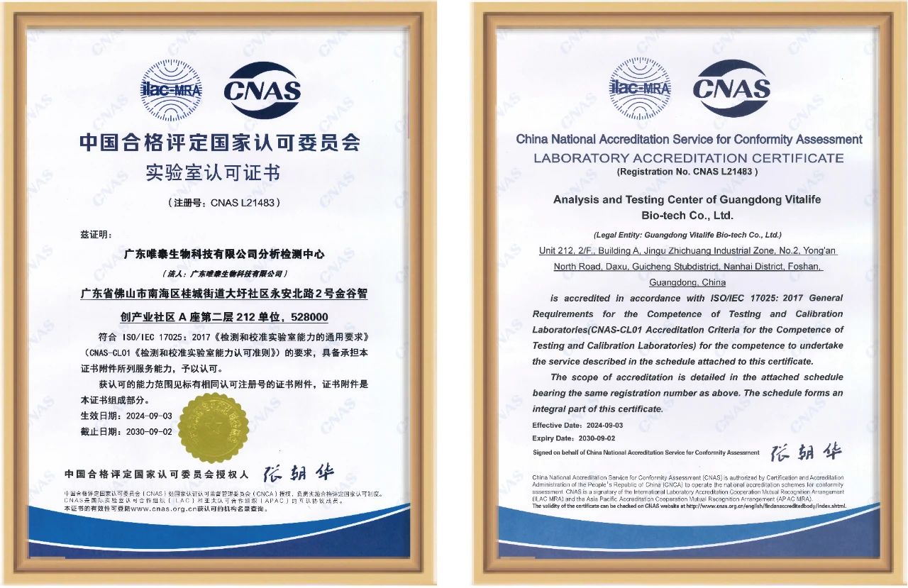 近日,唯泰生物分析檢測中心獲得中國合格評定國家認(rèn)可委員會(CNAS)頒發(fā)的國家實驗室認(rèn)可證書(簡稱“CNAS證書”,注冊號:CNAS L21483),標(biāo)志著唯泰生物的細(xì)胞檢測能力、硬件設(shè)施及實驗室管理水平均達(dá)到了國家及國際認(rèn)可標(biāo)準(zhǔn),具備提供更為合規(guī)、精準(zhǔn)及具有國際權(quán)威性和公信力的檢測服務(wù)。
