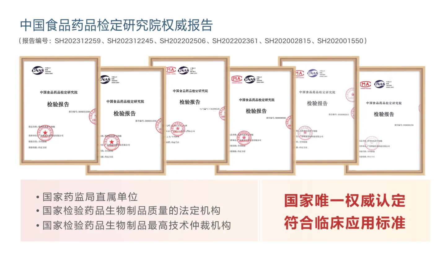 據(jù)悉,唯泰生物自創(chuàng)立以來,始終把細(xì)胞產(chǎn)品質(zhì)量和客戶健康安全放在第一位,以國家、國際最高安全標(biāo)準(zhǔn)建設(shè)自身的質(zhì)量安全管理體系。通過多年努力,唯泰生物目前已具備ISO9001:2015質(zhì)量管理體系、ISO14001:2015環(huán)境管理體系、ISO45001:2018職業(yè)健康安全管理體系等QES三體系,符合ISO\IEC 17025:2017檢測實驗室能力的通用要求,以及擁有六批次干細(xì)胞產(chǎn)品獲得中國食品藥品檢定研究院權(quán)威認(rèn)定等多項國家權(quán)威機構(gòu)認(rèn)證,彰顯了公司在細(xì)胞檢測、細(xì)胞生產(chǎn)技術(shù)及管理的實力。