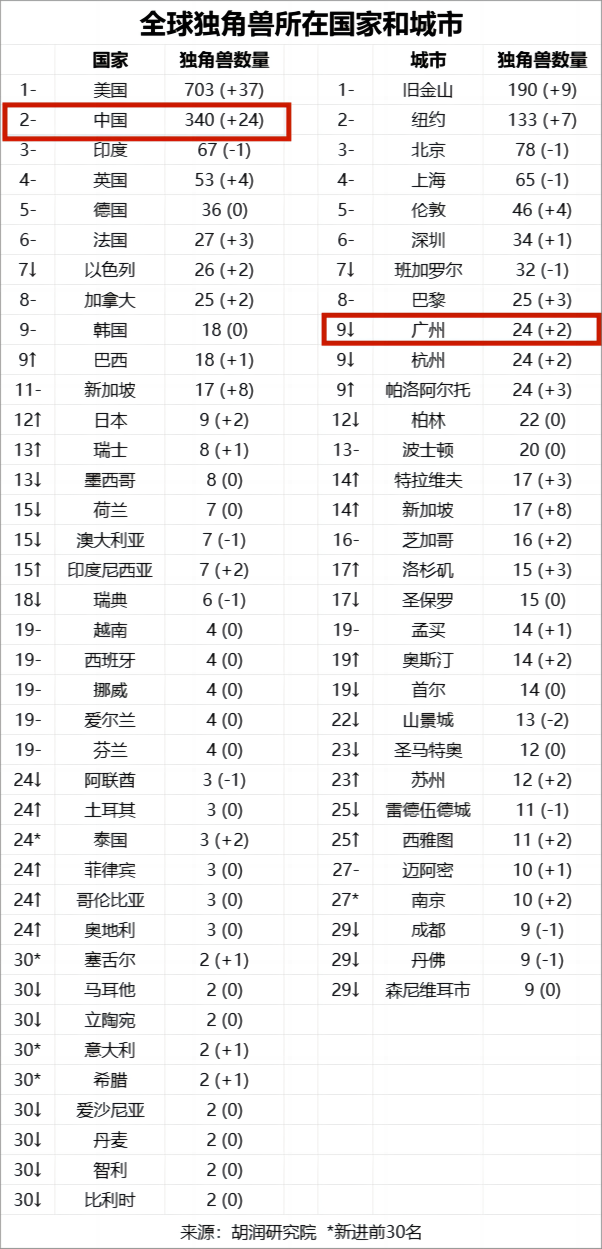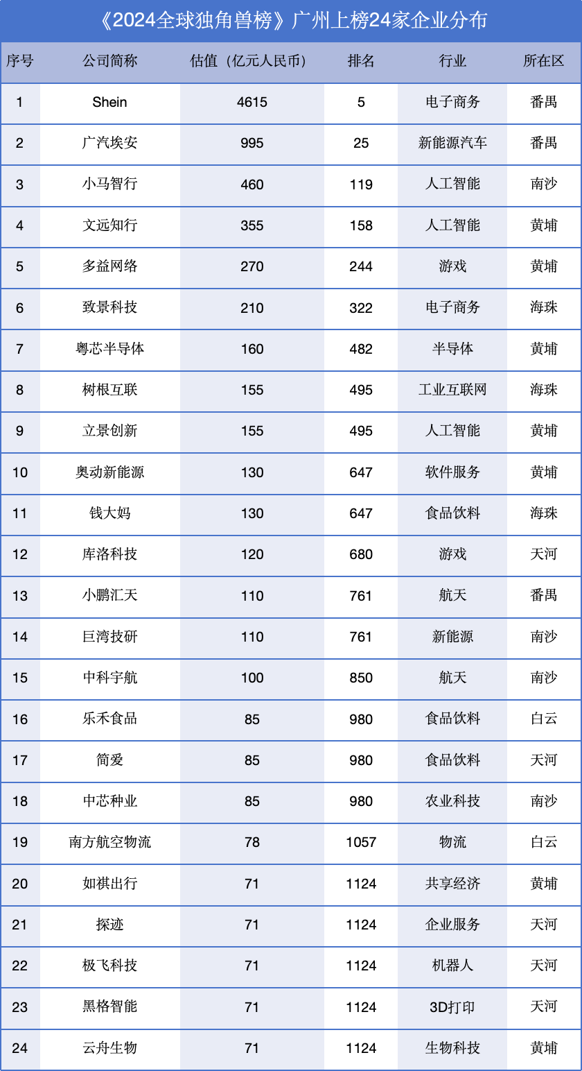 2024胡潤全球獨(dú)角獸榜單中,廣州有24家企業(yè)上榜,位居全球城市第9,全國第4。其中,中國十大獨(dú)角獸廣州占兩席,分別為希音(第3)、廣汽埃安(第10)。