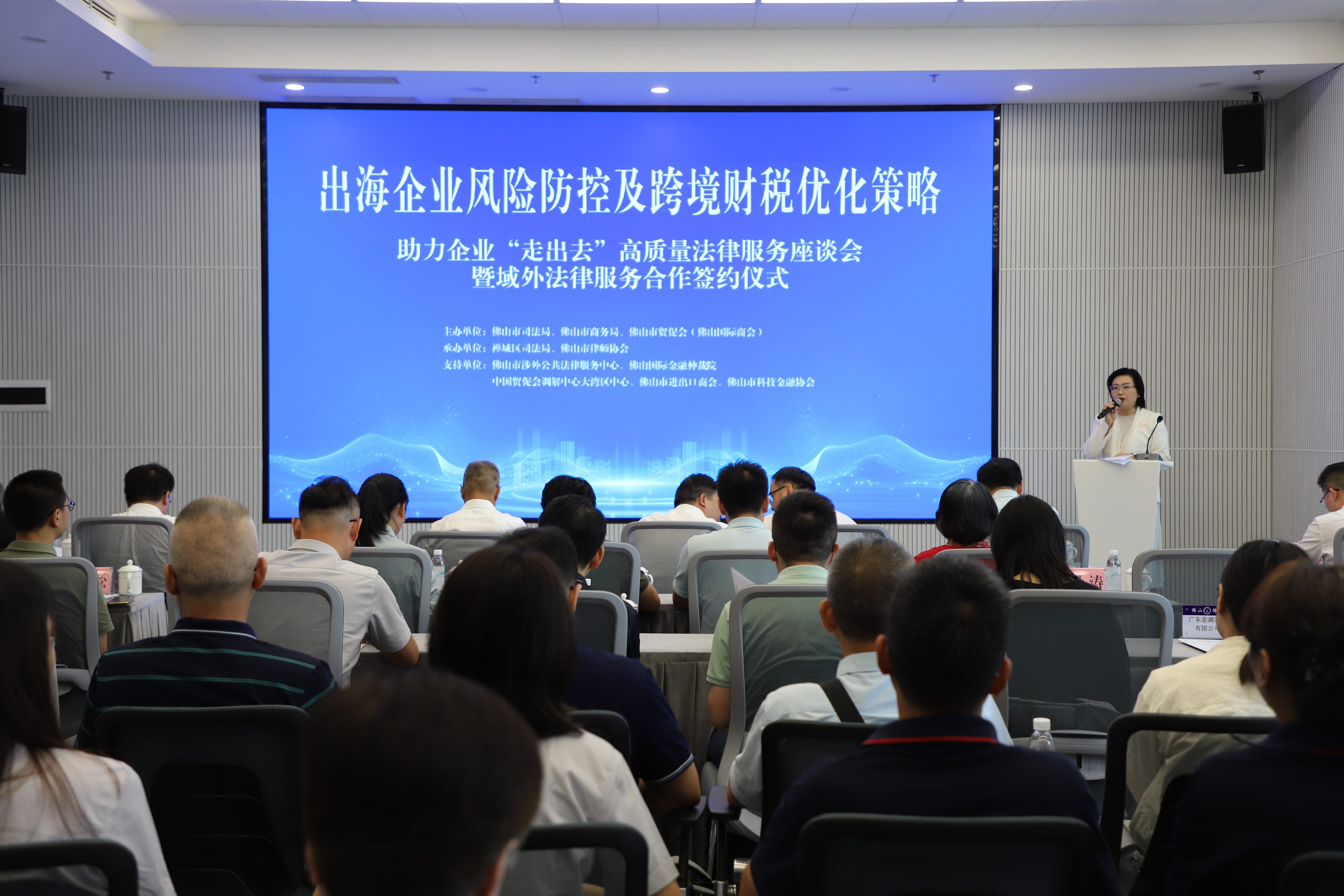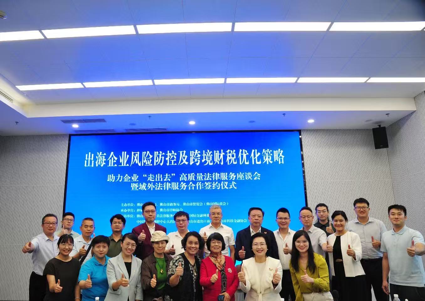 8月21日下午,由佛山市司法局、佛山市商務(wù)局、佛山市貿(mào)促會等單位聯(lián)合主辦的“出海企業(yè)風(fēng)險防控及跨境財稅優(yōu)化策略——助力中國企業(yè)‘走出去’高質(zhì)量法律服務(wù)座談會暨域外法律服務(wù)合作簽約儀式”在佛山中央法務(wù)區(qū)418會議室舉行。市司法局黨組書記、局長劉祖輝,市商務(wù)局黨組書記、局長葉敏堅,市貿(mào)促會黨組成員、副會長葛振海等領(lǐng)導(dǎo)出席活動并致辭,來自企業(yè)、律師代表及相關(guān)單位負(fù)責(zé)人近百人參會。佛山市科技金融協(xié)會作為支持單位,全程參與活動。