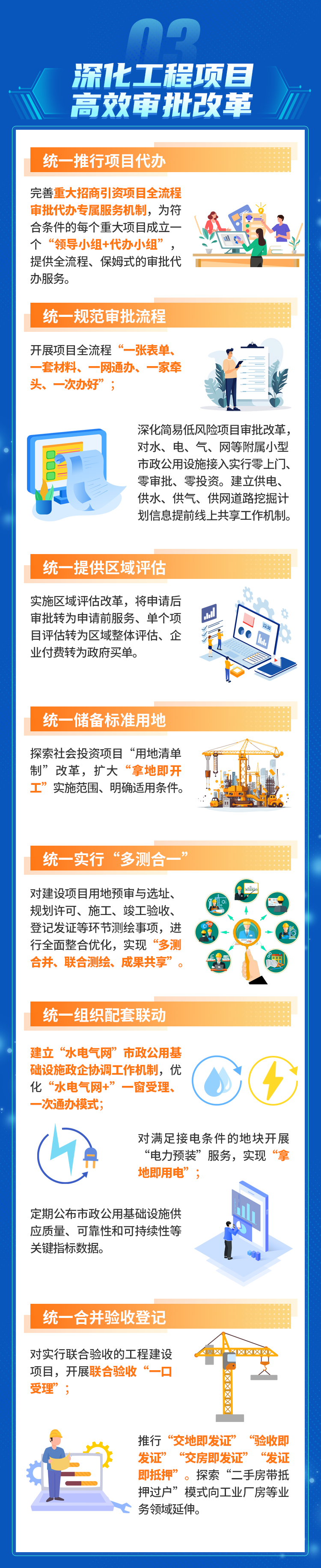 相比往年,今年的《方案》有不少新亮點。結(jié)合先進地區(qū)有益探索經(jīng)驗,聚焦指標領(lǐng)域突出問題,《方案》提出新增“建立‘水電氣網(wǎng)’市政公用基礎(chǔ)設(shè)施道路挖掘計劃提前共享機制”“定期公布市政公用基礎(chǔ)設(shè)施供應質(zhì)量、可靠性和可持續(xù)性等關(guān)鍵指標數(shù)據(jù)”“探索‘二手房帶抵押過戶’模式向工業(yè)廠房等業(yè)務領(lǐng)域延伸”等改革舉措,深化工程項目高效審批改革,統(tǒng)一規(guī)范審批流程。