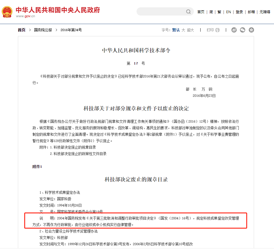 2016年,科技部根據(jù)《國務(wù)院辦公廳關(guān)于做好行政法規(guī)部門規(guī)章和文件清理工作有關(guān)事項的通知》(國辦函〔2016〕12號)精神,按照依法行政、轉(zhuǎn)變職能、加強監(jiān)管、優(yōu)化服務(wù)的原則和穩(wěn)增長、促改革、調(diào)結(jié)構(gòu)、惠民生的要求,決定對《科學(xué)技術(shù)成果鑒定辦法》、《科技成果評價試點暫行辦法》等規(guī)章予以廢止。今后,科技成果評價工作將全面展開,由專業(yè)評價機構(gòu)開展科技成果評價工作。