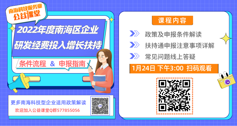 為更好幫助南海區(qū)企業(yè)進(jìn)行申報(bào)工作,南海區(qū)科技局、區(qū)生產(chǎn)力促進(jìn)中心將于1月24日15:00開(kāi)設(shè)公益課堂,為企業(yè)帶來(lái)政策及申報(bào)解讀,并對(duì)常見(jiàn)問(wèn)題進(jìn)行線上答疑。感興趣的企業(yè)屆時(shí)可掃描下方二維碼關(guān)注。