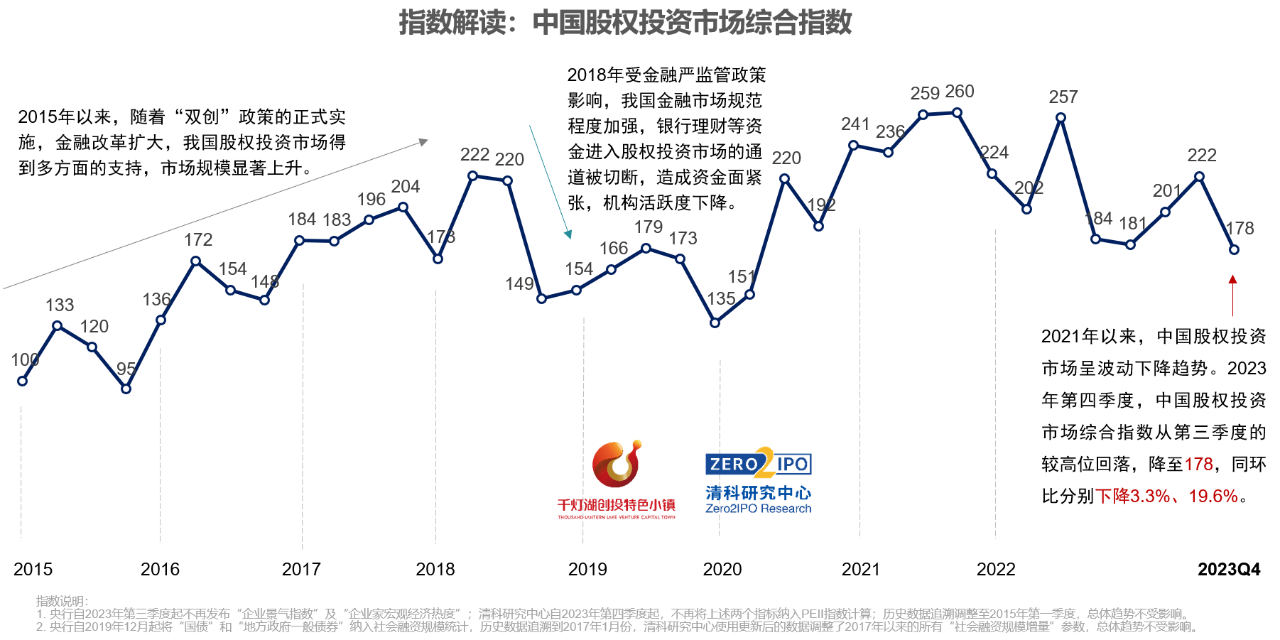 2023年第四季度,中國股權(quán)投資市場綜合指數(shù)為178,同比下降3.3%,環(huán)比下降19.6%,市場活躍度處于近三年最低水平。