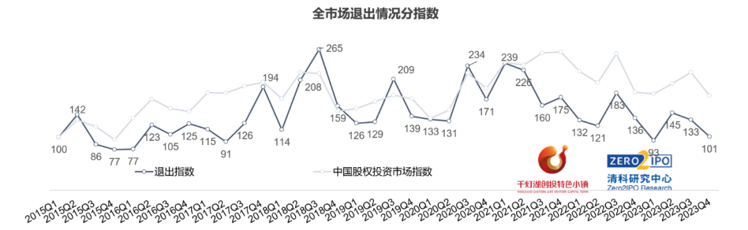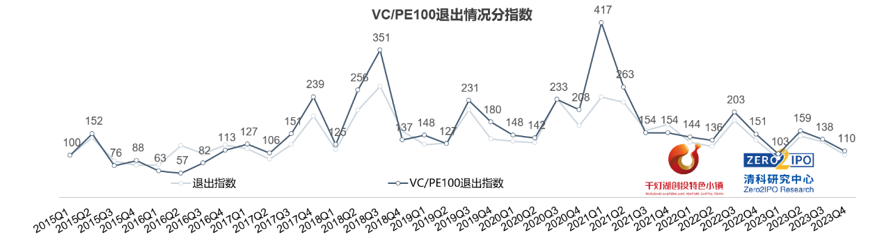 2023年第四季度,中國VC/PE100退出分指數(shù)為110,同環(huán)比分別下降27.0%、20.0%,與全市場走勢基本保持一致。