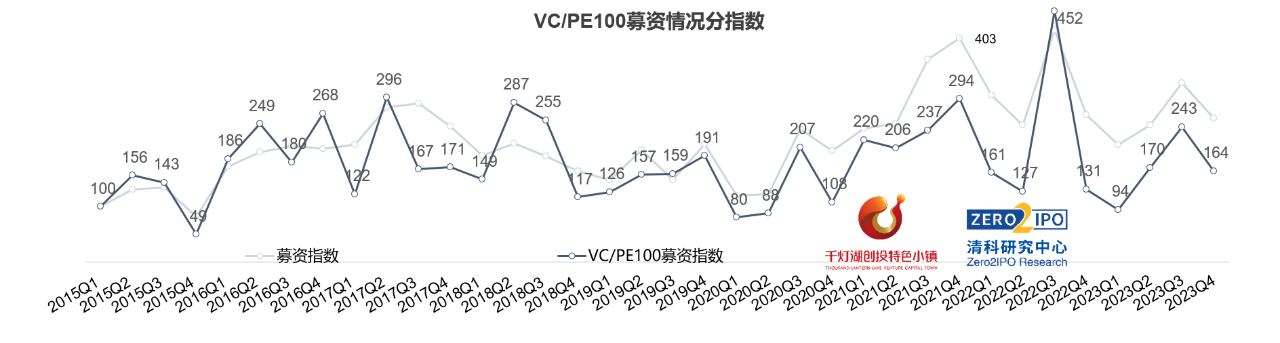 2023年第四季度,中國VC/PE 100指數(shù)募資分指數(shù)為164,同比上升25.2%,環(huán)比下降32.6%;同比上升的主要原因是2022年頭部機(jī)構(gòu)募資活動高度聚集在第三季度, 2022Q4募資分指數(shù)因儲備交易已高度釋放而大幅回撤至歷史低位。