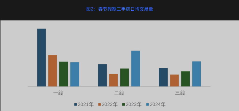 2024年春節(jié)假期8天,按日均統(tǒng)計(jì),一線城市比去年春節(jié)增加90%,僅略低于2021年;二線城市增加180%,三線城市增加140%,均大幅超過(guò)2023及2021年。