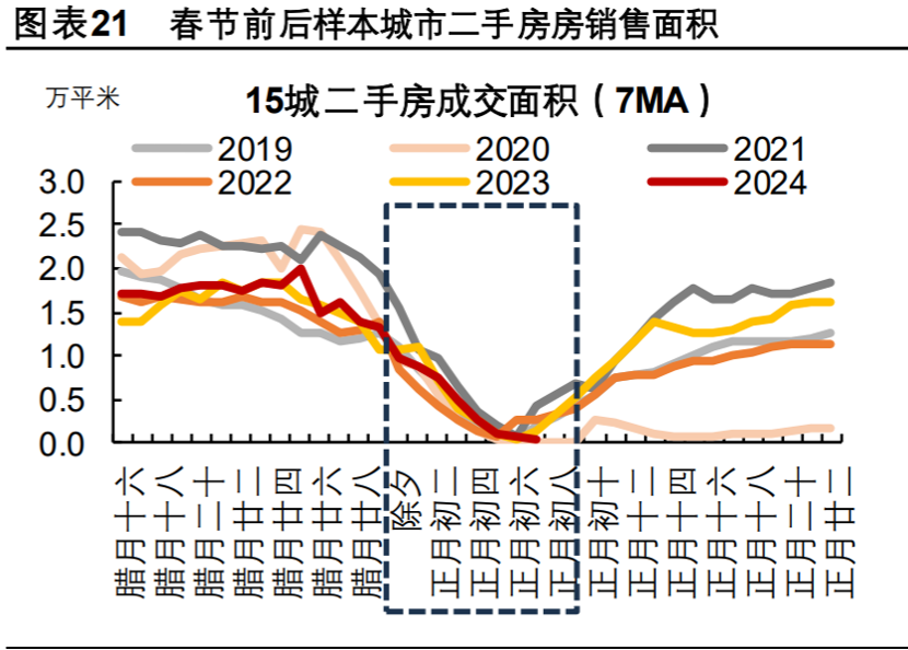 因?yàn)闅v年春節(jié)期間的成交量、尤其是二手房成交量很低,從平安證券的圖里面能直觀的看出來(lái)。