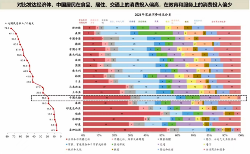 此前有機(jī)構(gòu)把中國(guó)人每年的消費(fèi)支出,衣食住行,和其他國(guó)家作對(duì)比,對(duì)比發(fā)現(xiàn)我們?cè)谑称?、居住上面的投入偏高,在旅游等服?wù)上的投入偏低。
