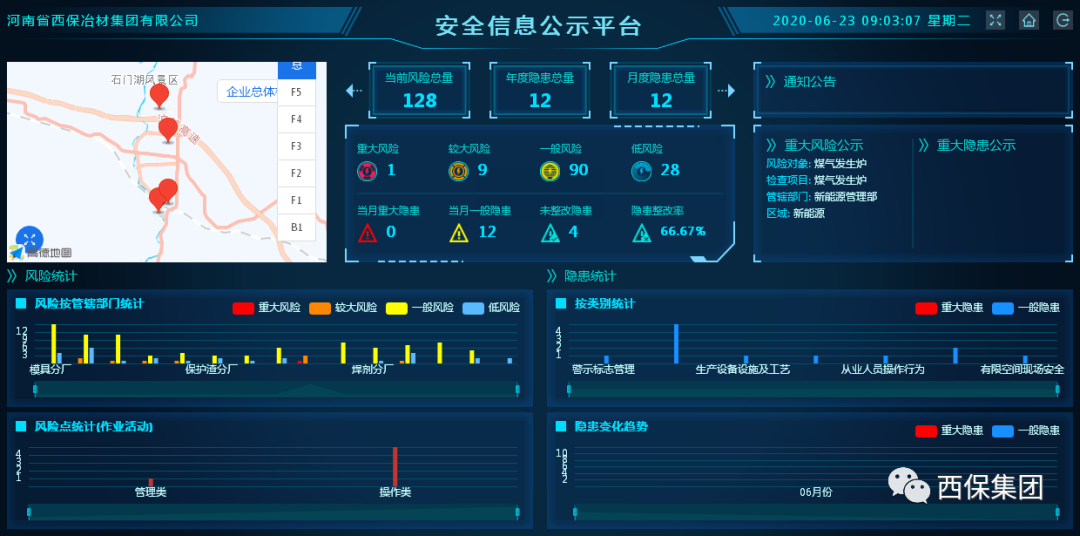 ? ? ? ?風(fēng)險(xiǎn)分級管控和隱患治理雙重預(yù)防體系是生產(chǎn)企業(yè)開展安全生產(chǎn)源頭治理、進(jìn)行風(fēng)險(xiǎn)隱患科學(xué)預(yù)防的有效途徑,也是落實(shí)安全生產(chǎn)企業(yè)主體責(zé)任的主要呈現(xiàn)方式。2019年6月,集團(tuán)公司開始籌建雙重預(yù)防體系線上辦公系統(tǒng)。該系統(tǒng)分為電腦端和手機(jī)端兩個(gè)平臺,其中,電腦端為部門管理系統(tǒng),集成了集團(tuán)公司總部各生產(chǎn)單元所有風(fēng)險(xiǎn)點(diǎn)與危險(xiǎn)源,以藍(lán)黃橙紅四色分布圖形式顯示各風(fēng)險(xiǎn)點(diǎn)安全風(fēng)險(xiǎn)狀況,藍(lán)色為最低等級,紅色為最高等級。同時(shí),根據(jù)后臺數(shù)據(jù)統(tǒng)計(jì),在安全信息公示平臺集中公示風(fēng)險(xiǎn)總量、隱患總量、重大風(fēng)險(xiǎn)隱患公示、隱患整改落實(shí)情況及變化趨勢,具有綜合性、直觀性、動態(tài)性特點(diǎn),便于安全生產(chǎn)管理部門在線上迅速查找薄弱環(huán)節(jié),提前做好防范工作。
